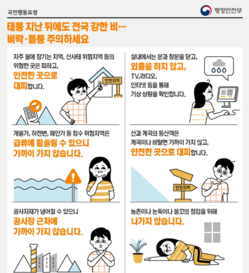 - 개울가, 하천변, 해안가 등 침수 위험지역은 급류에 휩쓸릴 수 있으니 가까이 가지 않습니다.