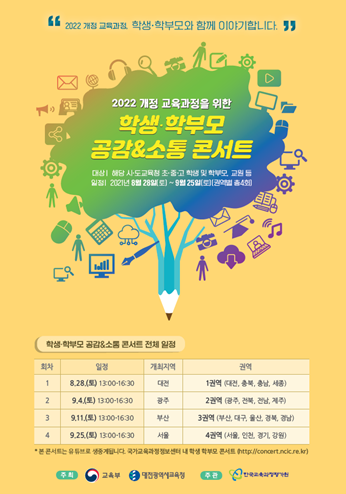 ‘학생·학부모 콘서트’는 8월 28일, 1차 콘서트를 시작으로 총 4회 진행 예정이며, 코로나 상황을 고려하여 많은 학생·학부모들이 참여할 수 있도록 온라인 및 현장-온라인 연계 방식으로 개최할 계획이다.
