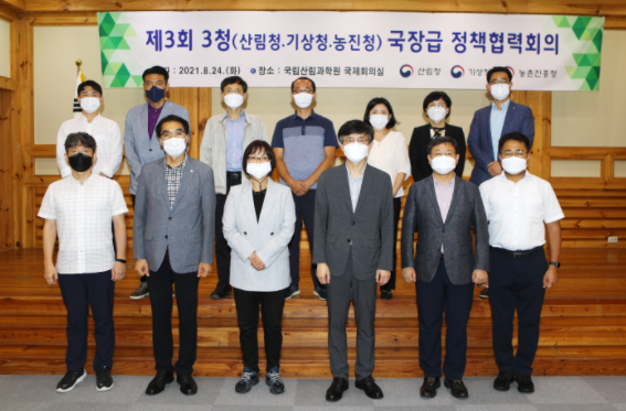 산림청 주관으로 개최된 제3차 3청 국장급 정책협력회의에는 산림청 국립산림과학원 산림환경보전연구부 이석우 부장, 기상청 기상서비스진흥국 이정환 국장, 농촌진흥청 농업환경부 김경미 부장 등이 참석했다.
