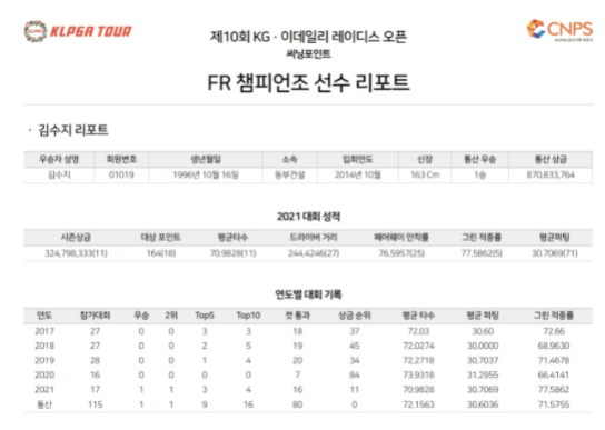 또한 KLPGA투어 최종라운드에 제공되는 ‘챔피언조 선수 리포트’와 ‘최종라운드 주요 선수 프로필’은 생생한 소식을 발 빠르게 전하는 미디어에 큰 도움이 될 것으로 기대하고 있다.