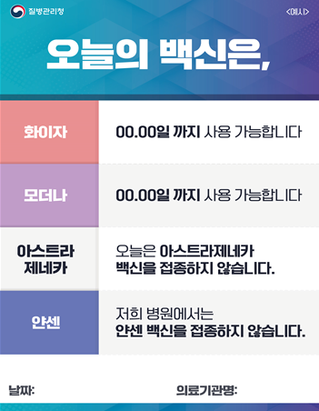 넷째, 접종기관에서는 배부된 유효기한 점검 일일체크리스트를 통해 매일 접종 전 백신별 유효기한을 자체 점검할 예정이며,특히, 접종기관은 당일 접종하는 백신의 종류와 유효기한 확인 후, 접종대상자가 쉽게 알아볼 수 있도록 대기실과 접종실에 ‘오늘의 백신’ 안내문을 9월 13일부터 게시하여야 한다.