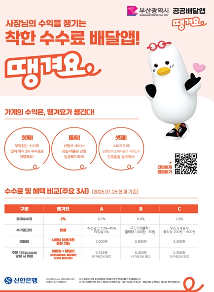 한편, 신한은행은 지역 소상공인의 어려움을 해소하기 위해 '땡겨요'에 가맹등록한 소상공인 등에게 200억 원 규모의 자금을 지원코자 14억 원을 특별출연한다.