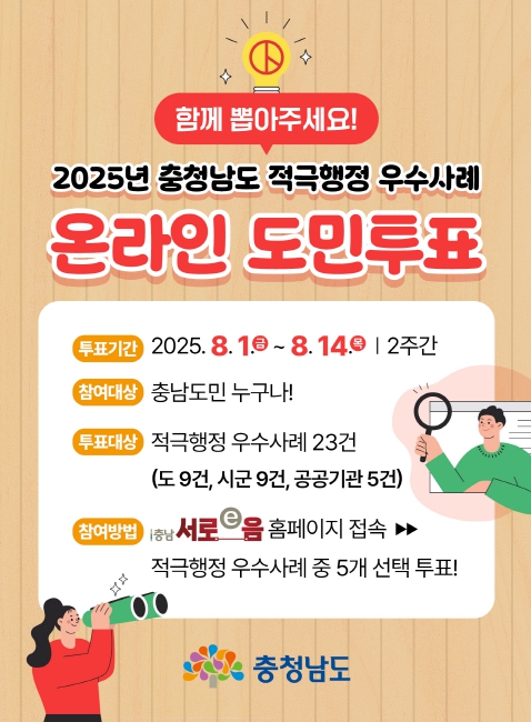 정찬형 도 정책기획관은 “도민 여러분의 투표가 충남형 적극행정의 방향을 정하는 데 큰 힘이 된다”라며 “공감할 수 있는 우수사례 선정을 위해 많은 관심과 참여를 부탁드린다”라고 말했다.