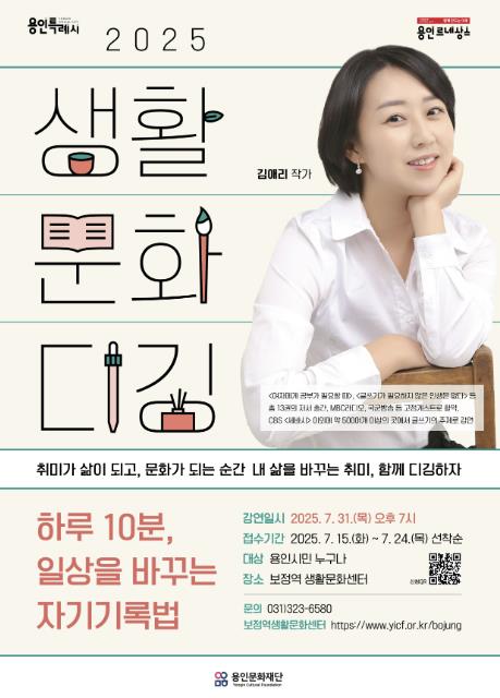 강연은 7월 31일에 개최되며, 『여자에게 공부가 필요할 때』, 『글쓰기가 필요하지 않은 인생은 없다』 등 총 13권의 저서를 펴낸 김애리 작가가 연사로 참여한다. 김 작가는 MBC 라디오와 국군방송 고정 게스트를 비롯해 ‘세상을 바꾸는 15분(세바시)’ 등 다양한 무대에서 대중과 활발히 소통해왔다. 이번 강연에서는 ‘하루 10분, 일상을 바꾸는 자기기록법’이라는 주제로, 소소한 글쓰기가 취미가 되고 일상을 변화시켜 결국 작가라는 직업으로 이어진 자신의 경험을 시민들과 나눌 예정이다.