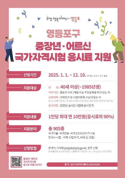 지원 대상은 신청일 기준 영등포구에 1개월 이상 거주 중인 40세 이상 미취업 및 미창업자다. 응시료의 90%, 1인당 최대 10만 원까지 지원되며, 올해 1월 1일 이후 응시한 시험이라면 횟수 제한 없이 신청 가능하다.