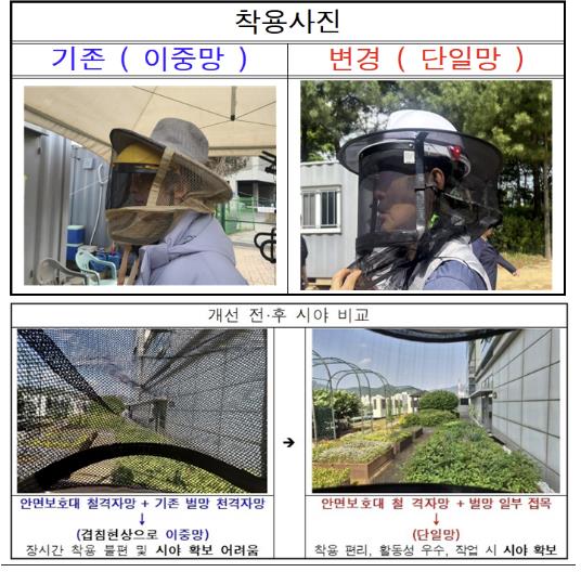 이제 공원‧녹지 관리 근로자들이 예초 시 전용 안전모에 별도로 벌쏘임 방지 벌망모자를 착용하지 않아도 되게 된 것이다. 이 두 가지를 같이 쓰게 됐을 때 발생하는 불편한 시야 문제도 해결됐다.