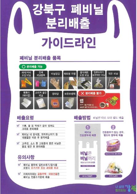 주민 참여를 높이기 위한 폐비닐-종량제봉투 교환 시범사업도 추진 중이다. 구는 지난 6월부터 삼양동, 번2동, 우이동을 중심으로 폐비닐을 일정량 이상 분리배출하면 종량제봉투로 교환해주며, 주민들의 실질적인 참여와 분리배출 습관 형성을 유도하고 있다.