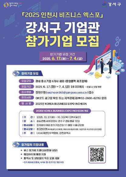 참가 대상은 사업자 등록과 법인 등기 소재지가 강서구인 중소기업 6개사다. 모집 기간은 7월 4일까지며, 신청을 희망하는 기업은 참가신청서 등을 작성해 지역경제과로 이메일 접수하면 된다.