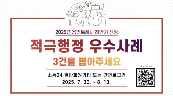 시 관계자는 “1차심사에 접수된 61건의 우수사례는 시민의 입장에서 추진한 적극행정으로, 도시계획과 복지, 시민의 일상생활 등 지역사회 다양한 분야에서 뚜렷한 성과를 거뒀고, 시민 삶의 질 향상에도 많은 기여를 한 것으로 평가받고 있다”며 “시민이 체감하고 도시의 가치를 향상할 수 있는 맞춤형 행정을 펼치기 위해 용인특례시 공직자들은 적극 노력할 것”이라고 말했다.