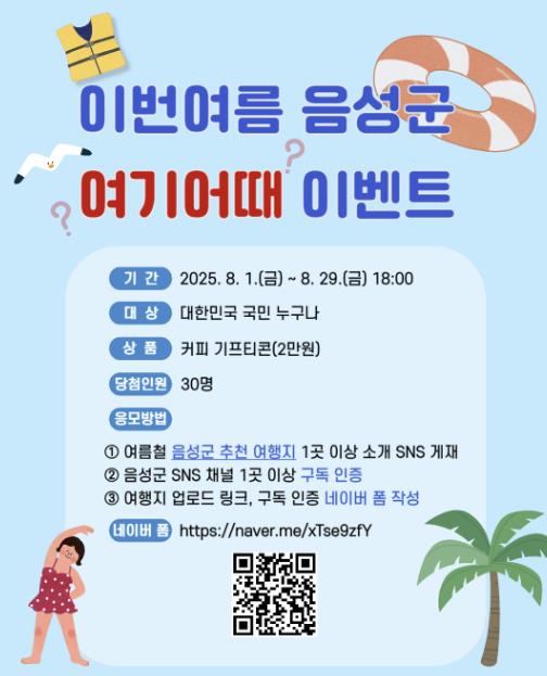 이번 이벤트는 오는 8월 1일부터 8월 29일 오후 6시까지 진행되며 참여 방법은 다음과 같다. 여름철 음성군 추천 여행지 1곳 이상을 개인 SNS에 업로드하고, 군 공식 SNS 채널 중 1곳을 구독하여 네이버 폼으로 제출하면 된다.
