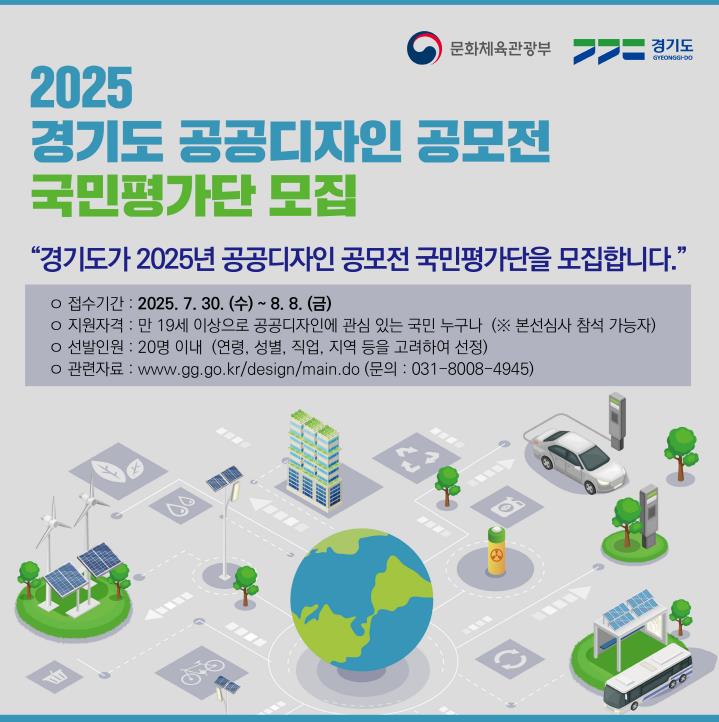 강길순 경기도 건축정책과장은 “재생에너지의 중요성이 높아진 시대에 지속가능한 친환경 도시를 만들 창의적인 공공디자인 아이디어를 선정하는 과정에서 국민평가단의 역할이 매우 크다”라며 “공공디자인에 관심 있는 분들의 많은 참여를 기대한다”고 말했다.