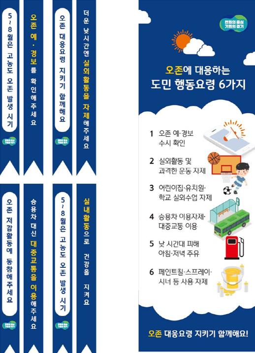 이에 캠페인에서 도는 ▲오존 예․경보 확인(오존농도 0.5ppm/h 이상일 때는 중대경보로, 실외활동 중지) ▲실외활동 자제 ▲어린이집․유치원․학교 실외수업 자제 ▲대중교통 이용 ▲휘발성 제품 사용 자제 ▲한낮 주유 자제 등6대 도민 행동 요령을 안내했다.