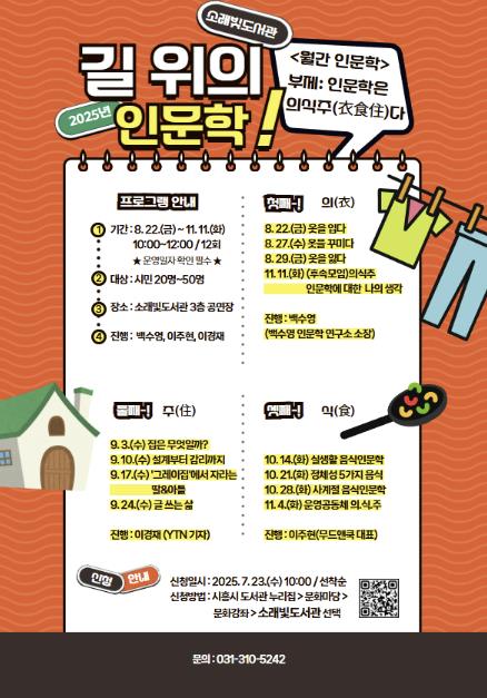 첫 번째 강연인 ‘의(衣)’는 백수영 인문학연구소 소장이 맡아, 옷을 통해 인간의 삶과 문화를 성찰하는 인문학적 시선을 제시한다. 두 번째 주제 ‘식(食)’에서는 이주현 무드앤쿡 대표가 매일 접하는 음식 속 인문학적 이야기를 풀어내며, 세 번째 강연 ‘주(住)’는 이경재 YTN 기자가 ‘집짓기와 인생 짓기’를 주제로 집의 의미와 가치를 함께 탐색한다.