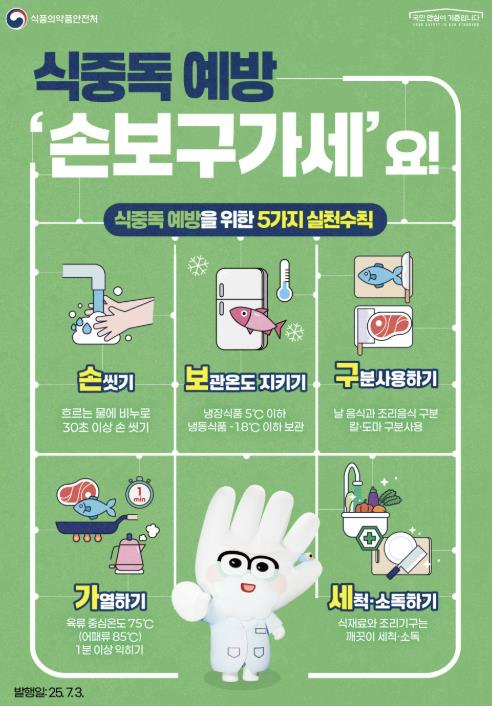시는 현장 점검과 함께 시민들이 일상에서 실천할 수 있는 식중독 예방수칙 ‘손보구가세’를 함께 안내하고 있다. ‘손보구가세’는 ▲손 씻기 생활화 ▲보관 온도 지키기 ▲구분 사용하기 ▲가열하기 ▲세척ㆍ소독하기 등 다섯 가지 기본 위생 수칙으로, 가정에서도 손쉽게 실천할 수 있는 예방법이다.