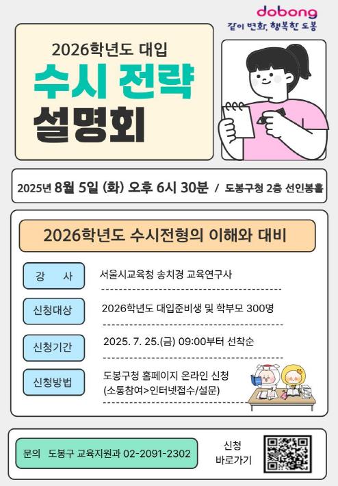 오언석 도봉구청장은 “8월은 입시 전략을 점검하고 진로를 구체화하기에 중요한 시기.”라며, ”이번 설명회와 맞춤형 상담이 급변하는 입시 환경에서 수험생에게 실질적인 도움이 되길 바란다.“라고 말했다.