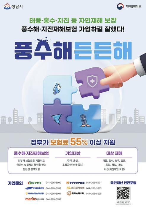성남시 관계자는 “최근 국지성 호우 등으로 인한 자연재해 피해가 늘고 있는 만큼, 특히 지하층 주택이나 온실 등 침수에 취약한 지역에 거주하시는 시민들께서는 반드시 풍수해보험에 가입해 피해에 미리 대비해 주시길 바란다”고 당부했다.