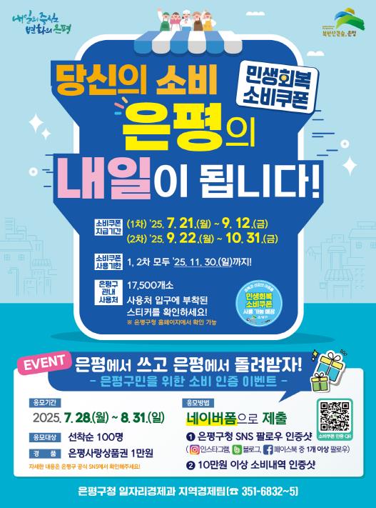 이번 이벤트는 은평구 공식 SNS 중 1곳 이상을 팔로우하고, 민생회복 소비쿠폰으로 은평구 내에서 10만 원 이상 사용한 내역을 인증하면, 은평사랑상품권 1만 원을 지급하는 방식으로 진행된다.