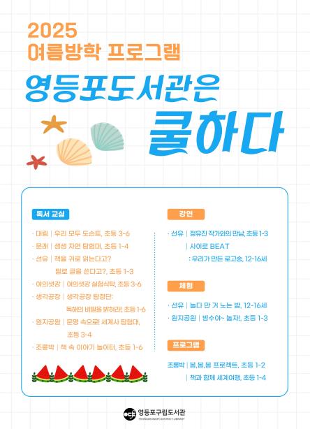 최호권 영등포구청장은 “책과 체험이 있는 도서관에서 학생들이 뜻깊은 여름방학을 보내길 바란다”라며 “앞으로도 아이들이 즐겁게 배우고 성장할 수 있는 교육 문화 프로그램을 지속 확대해 나가겠다”라고 전했다.