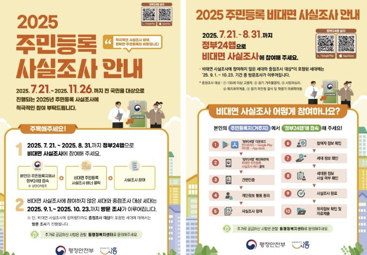 이번 사실조사는 1단계 비대면 디지털 조사와 2단계 방문 조사를 병행해 추진된다. 먼저 7월 21일부터 8월 31일까지는 ‘정부24’ 앱을 통한 비대면 조사가 진행되며, 9월 1일부터 10월 23일까지는 통장 및 동 주민센터 담당 공무원이 직접 세대를 방문해 현장 확인 조사를 한다.