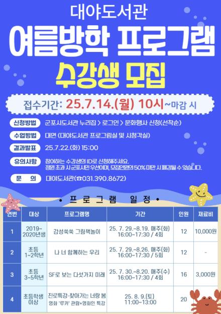 수강신청은 7월 14일 오전 10시부터 군포시도서관 누리집에서 선착순으로 진행한다. 자세한 내용은 군포시도서관 누리집 공지사항을 확인하거나 대야도서관으로 문의하면 안내받을 수 있다.