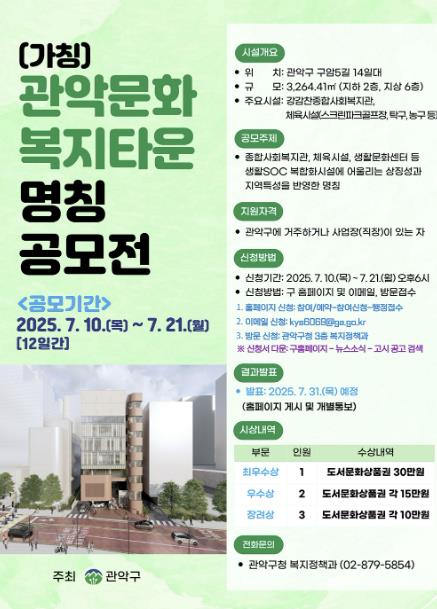 관악문화복지타운의 새 명칭 공모는 관악구에 주민등록 되어 있거나 사업장(직장), 학교 등이 위치한 생활권자라면 누구나 참여할 수 있다.
