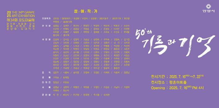 "2025 제34회 포도미술제"는“50th 기록과 기억”이라는 전시 주제로 50년이라는 시간 속에 쌓여온 수많은 예술의 흔적과 미술인 각자의 삶을 재조명하여 앞으로의 창작 활동에 새로운 에너지를 충전하고자 한다.