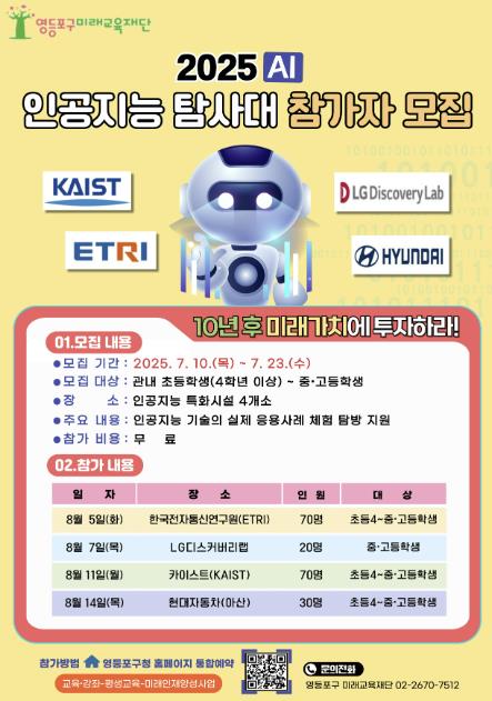 영등포구 미래교육재단 관계자는 “청소년들이 인공지능을 미래 사회의 핵심 기술로 인식할 수 있도록 돕고자 한다”라며 “앞으로 산학협력 기반의 다양한 프로그램을 발굴해 지역 청소년들이 글로벌 경쟁력을 갖춘 인재로 성장할 수 있도록 지원을 이어가겠다”라고 전했다.