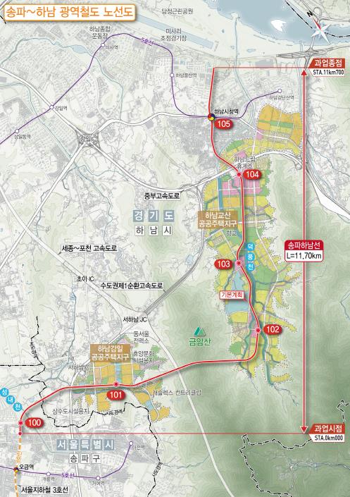 승인된 송파하남선 기본계획에는 ▲서울지하철 3호선 오금역에서 하남 감일지구~교산신도시~5호선 하남시청역까지 6개 역사 설치 ▲지하철 5·8호선 ·GTX·SRT 등과 환승 연계 ▲하남 교산 신도시 입주민의 출퇴근 시간 대폭 단축(하남시청에서 강남고속버스터미널까지 버스 기준 70분→40분) 등 수도권 동남부 지역의 교통 편의성이 대폭 증대될 것으로 전망한다.
