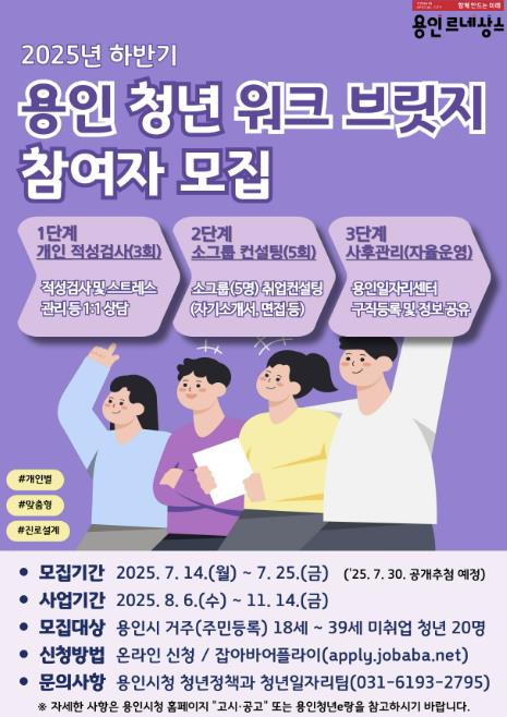 모집 대상은 공고일 기준 용인시에 주소를 둔 만 18세 이상 39세 이하 미취업 청년이며, 7월 25일까지 ‘잡아바 어플라이 통합접수시스템’을 통해 온라인으로 신청할 수 있다.