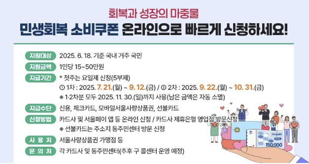소비쿠폰은 1차로 7월 21일부터 9월 12일까지 소득수준에 따라 15만 원에서 40만 원까지 지급된다. 이후 9월 22일부터 10월 31일까지 소득 상위 10%를 제외한 구민에게 10만 원씩 추가 지급된다.