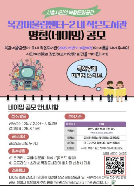 이번 명칭 공모는 목감 지역의 새로운 복합문화공간이 될 작은도서관에 시민 참여를 제안해 개관 홍보 효과를 높이고 지역 주민의 관심을 유도하고자 마련됐다.