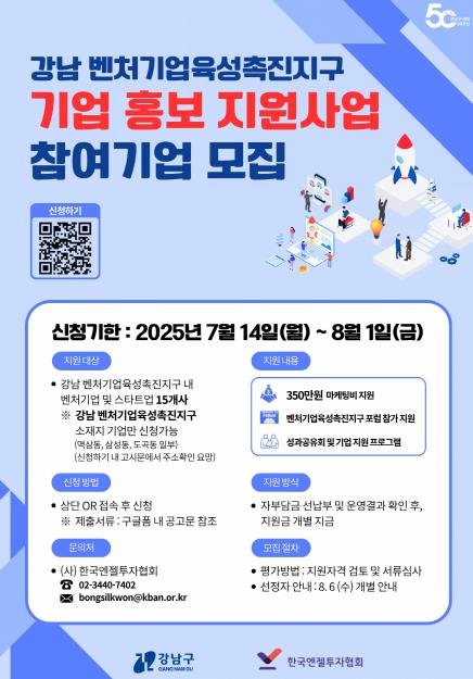조성명 강남구청장은 “강남구의 벤처기업육성촉진지구는 단순한 공간 지정이 아닌 실질적인 기업 성장을 돕는 플랫폼이 되어야 한다”며 “이번 지원사업이 참여 기업들에게 내실 있는 성과로 이어져 강남이 대한민국을 대표하는 혁신의 중심지로서 위상을 더욱 확고히 하길 기대한다”고 밝혔다.