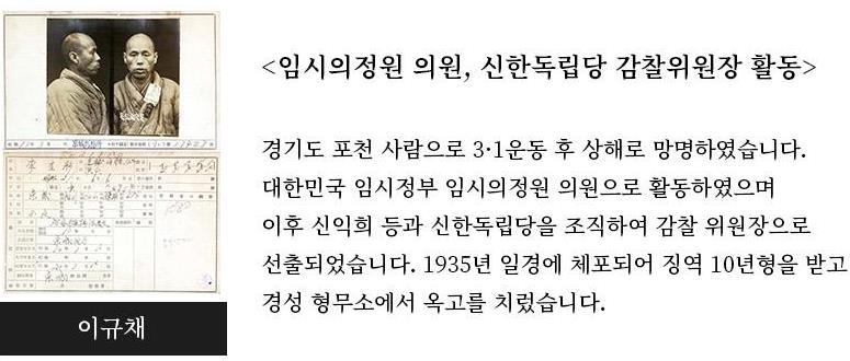 이번에 공개된 인물을 구체적으로 살펴보면 이규채 독립운동가는 포천 출신으로 3·1운동 후 상해로 망명해 대한민국 임시정부 임시의정원 의원으로 활동했다. 이후 신익희 등과 신한독립당을 조직해 감찰위원장으로 선출됐다. 1935년 일경에게 체포돼 경성 형무소에서 옥고를 치렀다.