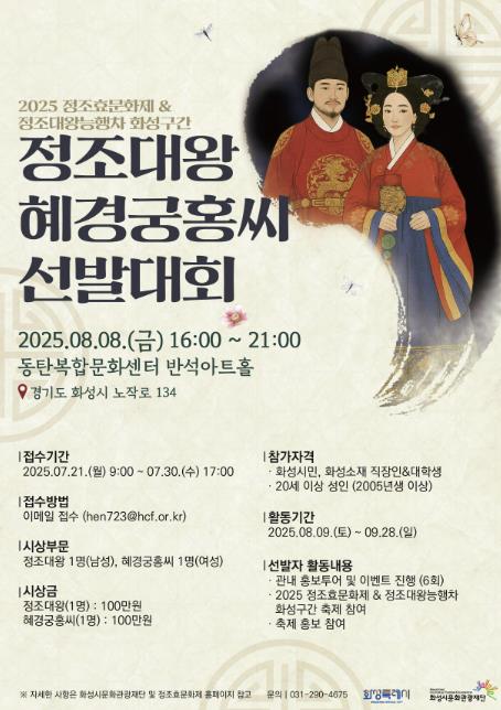 이번 선발대회는 시민이 정조대왕과 혜경궁홍씨로 분해 역사적 인물을 직접 연기하는 신규 프로그램으로, 축제의 상징성과 참여성을 높이기 위해 새롭게 기획됐다.
