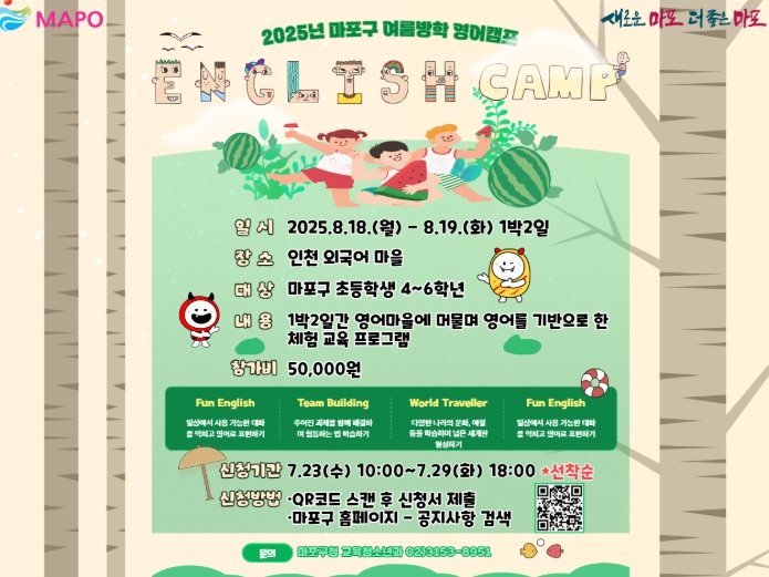 박강수 마포구청장은 “이번 영어캠프가 단순히 영어를 배우는 것을 넘어 자신감과 글로벌 역량을 높이는 계기가 되길 바란다”라며, “마포구는 어린이들이 세계적인 무대에서 활약을 펼치는 인재로 성장할 수 있도록 실용 중심의 교육 환경을 지속해서 만들어나가겠다”라고 말했다.