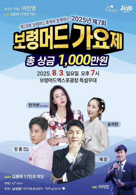 보령시가 주최하고 보령축제관광재단과 뉴스프리존 대전·세종·충남취재본부가 공동으로 주관하는 이번 가요제에는 MC 이덕진의 사회로 미스트롯 3 출신 천가연을 비롯해 재강, 진홍, 홍지연 등 인기 연예인들이 초청가수로 출연한다. 또한 김용태 악단의 17인조 오케스트라가 무대를 더욱 풍성하게 만들어줄 예정이다.