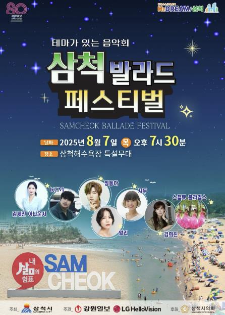 8월 7일 저녁 7시 30분부터 삼척해수욕장 특설무대에서 한여름 밤의 발라드를 테마로 한 ‘삼척 발라드 페스티벌’이 개최된다. 이번 공연은 탁 트인 바다를 배경으로, 시원한 파도 소리와 함께 감미로운 발라드 선율을 즐길 수 있는 특별한 시간으로 마련된다.
