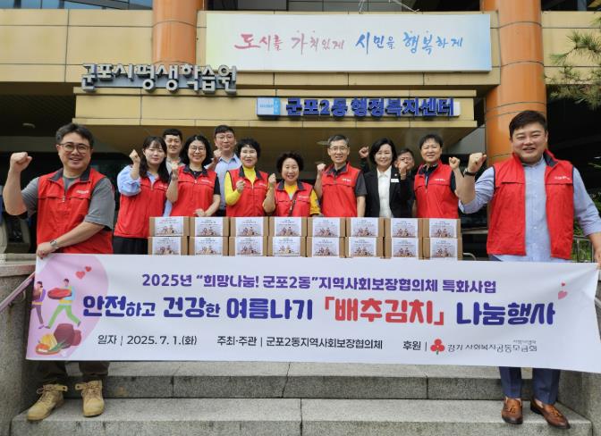 이날 행사에서는 군포2동 지역사회보장협의체 위원들이 저소득 취약계층 85가구에 배추김치를 직접 전달하며 안부를 묻고, 여름철 폭염 및 재난 대응요령을 안내하는 등 안전한 여름나기 홍보에 앞장섰다.