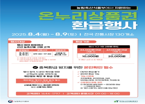 행사 기간 동안 국내산 신선 농축산물을 구매한 소비자에게 구매 금액에 따라 최대 30%까지 온누리상품권으로 환급해 준다.