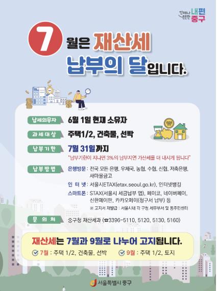 재산세 납부 대상은 올해 6월 1일 기준 주택, 토지, 건축물 등을 소유한 자다. 이번 7월 과세 대상은 주택분 1/2과 건축물, 선박이다. 나머지 주택분 1/2과 토지분은 오는 9월에 부과 예정이다.