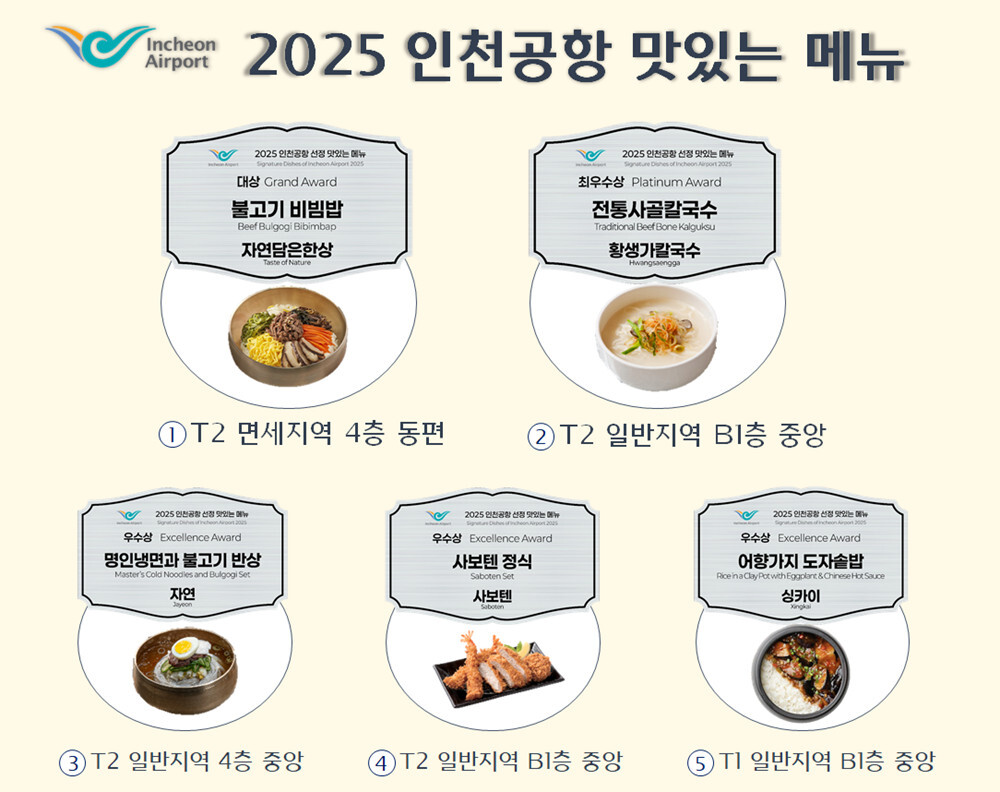 이번에 선정된 메뉴는 총 5종으로, 대상에는 △‘자연담은한상’의 불고기비빔밥(T2(제1여객터미널) 면세지역 4층), 최우수상에는 △‘황생가칼국수’의 전통사골칼국수(T2(제2여객터미널) 일반지역 지하1층)가 각각 선정됐다.