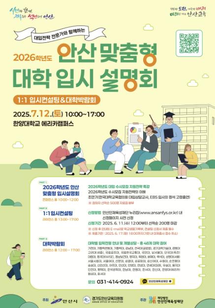 이번 행사는 수험생과 학부모들이 다변화하는 대입제도에서 혼란을 겪지 않도록 정확한 정보를 제공해 체계적인 학습 전략을 세울 수 있도록 마련됐다. 행사는 안산시와 안산교육지원청이 공동 주최하고 (재)안산인재육성재단 주관하에 진행된다.