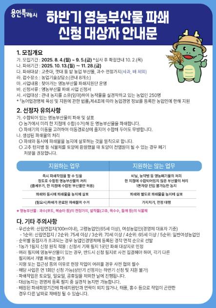 신청은 지역 내 농업기술상담소 8곳에서 가능하며, 대상지 선정 결과는 10월 2일 개별 안내된다.