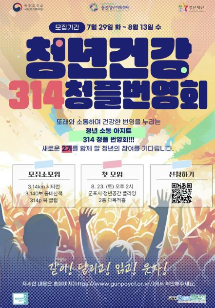 이 사업은 청플의 주소인 ‘번영로 314’를 활용한 도시형 건강 소모임 프로그램이다. ▲군포시 명소를 달리는 러닝 소모임 ‘3.14km 시티런’ ▲동네 친구들과 함께 걷고 교류하는 산책 소모임 ‘3,140보 동네산책’▲314쪽의 책을 함께 읽는 북클럽 등 세 가지 소모임으로 구성됐다.