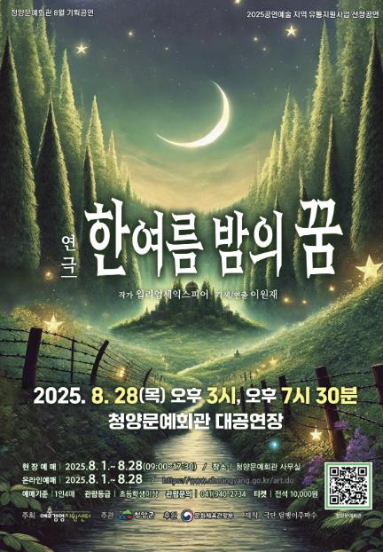 이번 공연은 초등학생 이상 관람 가능하며, 관람료는 전석 1만 원이다. 관람권 예매는 8월 1일부터 시작돼 공연 당일까지 청양문예회관 사무실과 홈페이지에서 동시에 진행되며 1인 4매까지 구매가 가능하다.