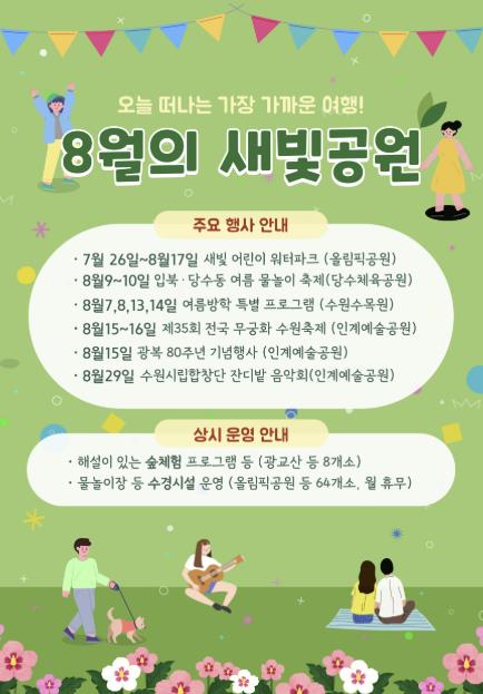 ▲올림픽공원 ‘새빛 어린이 워터파크’(7월 26일~8월 17일) ▲당수체육공원 ‘입북·당수동 여름 물놀이 축제’(8월 9~10일) ▲인계예술공원 ‘수원시립합창단 잔디밭 음악회’(8월 29일) 등 다채로운 프로그램을 운영한다.