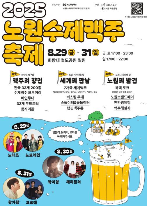 먼저, 8월의 피날레를 장식할 '노원수제맥주축제'이다. 오는 8월 29일부터 31일까지 3일간은 노원이 가장 시원해지는 시간이다. 화랑대 철도공원 일원에서 열리는 제3회 노원수제맥주축제(Nowon Beer Festival, NBF)는 전국 33개 브루어리의 200여 종 수제맥주, 7개국 세계맥주, 그리고 32대의 푸드트럭과 함께하는 맥주 애호가들의 축제다. 한낮의 더위를 피해 시간도 조절했다. 금요일과 토요일은 17시부터 23시까지, 일요일은 17시부터 22시까지 운영한다.