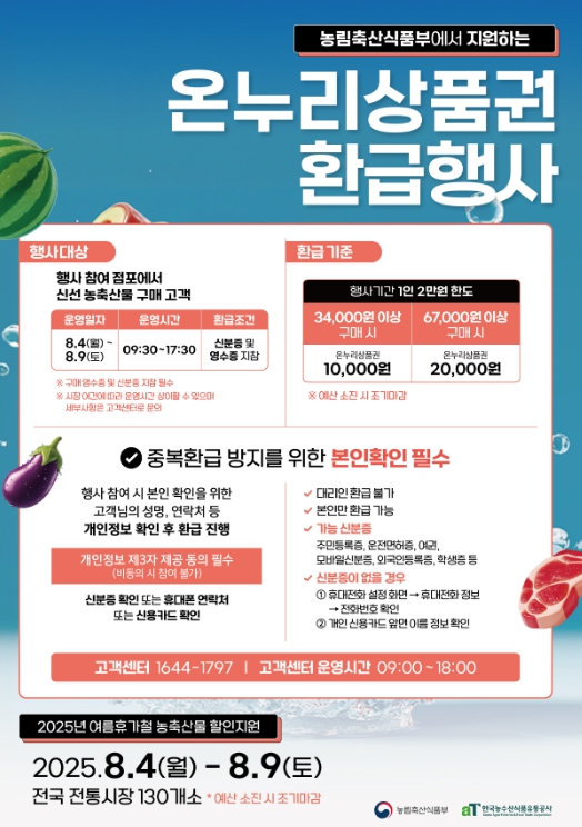 농식품부는 그간 설과 추석 등 명절에 맞춰 온누리상품권 환급행사를 이어왔으나, 최근 여름철 물가 부담이 커지면서 국민 체감 물가를 낮추기 위한 차원에서 이번에는 여름 휴가철에도 행사를 마련했다.