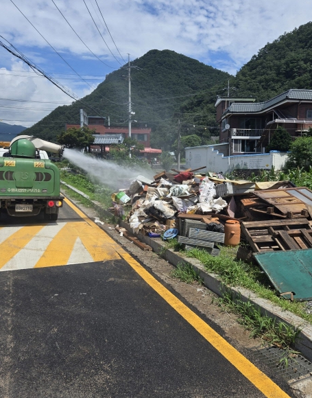 방역팀은 인력이 접근하기 어려운 산사태 지역까지 방역특장차를 동원해 소독 작업을 했다. 또 방역약품을 활용해 감염 매개체 서식처를 집중 방역소독했다.