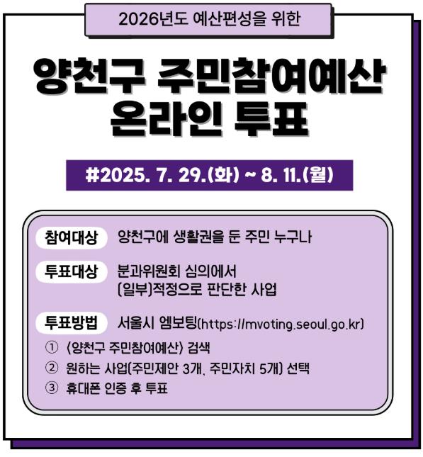 최종 선정 사업은 온라인 투표 결과(30%)와 주민참여예산 심의위원회 총회 투표 결과(70%)를 합산해 결정되며, 양천구의회의 심의·의결을 거쳐 2026년도 예산에 반영될 예정이다.
